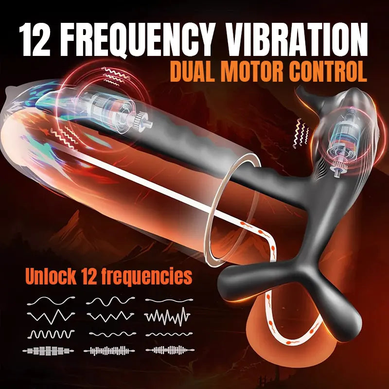 Equipped with dual motors, this vibrating cock ring delivers dual vibrations to simultaneously stimulate the C-spot, G-spot, and glans. Choose from 12 different vibration modes, easily adjustable via the on/off button or the remote control for tailored pleasure.